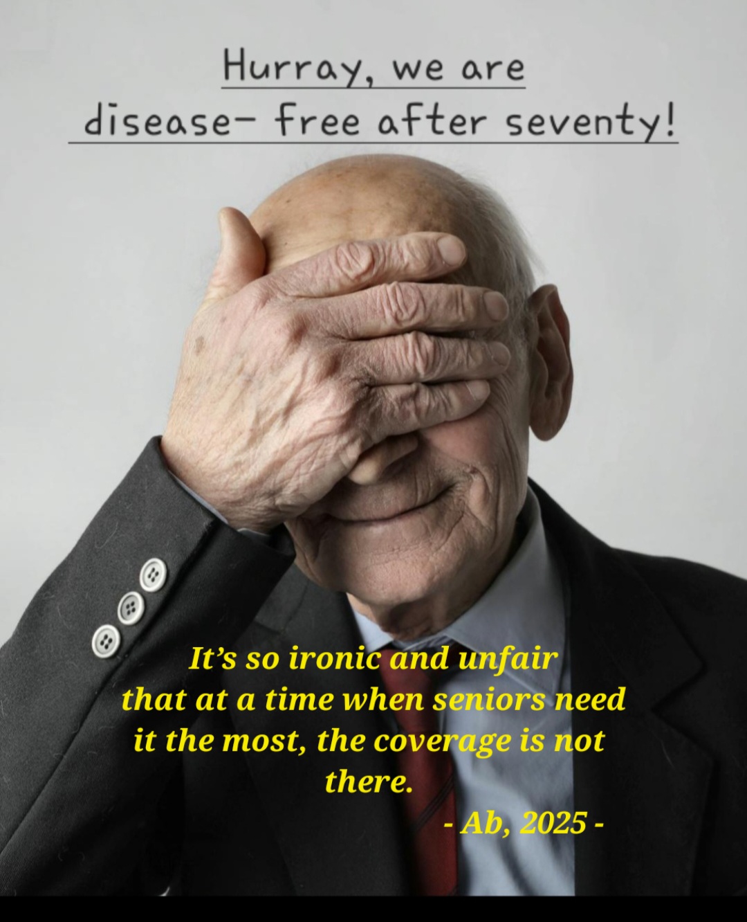 “Hurray, we are disease- free after seventy!, said the ‘insurance’, after decades of collecting premiums from me!” cried my uncle. “Now is the time that I am unemployed and unwell, and the insurance doesn’t cover me. I have to dig into my savings!”