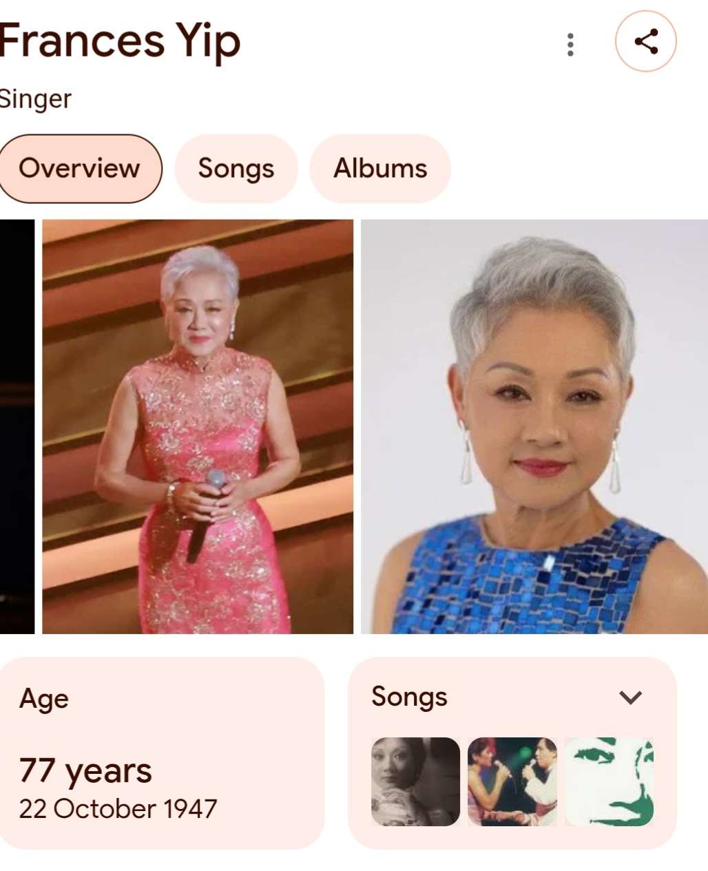 Hong Kong singer Frances Yip was diagnosed with breast cancer in 1996 and is now cancer-free, having recovered in 2002. Since her recovery, she has become an advocate for breast cancer awareness, participating in charity events like the Hong Kong Breast Cancer Foundation’s fundraising concert and sharing her story to encourage others.