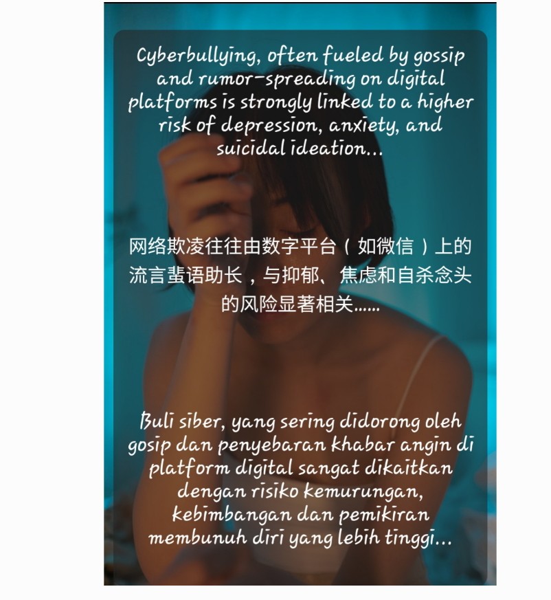 Buli siber, yang sering didorong oleh gosip dan penyebaran khabar angin di platform digital sangat dikaitkan dengan risiko kemurungan, kebimbangan dan pemikiran membunuh diri yang lebih tinggi...