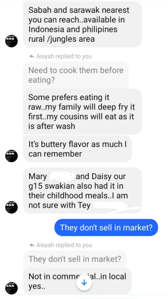 To the locals, Sago Grub or Sago Worm is a delicacy eaten raw or fried. These creamy, yellow, and fat worms are rich in protein. They are sold at US$0.25 each (RM40 – 45 per Kg)! They are still a hot selling item in local market.